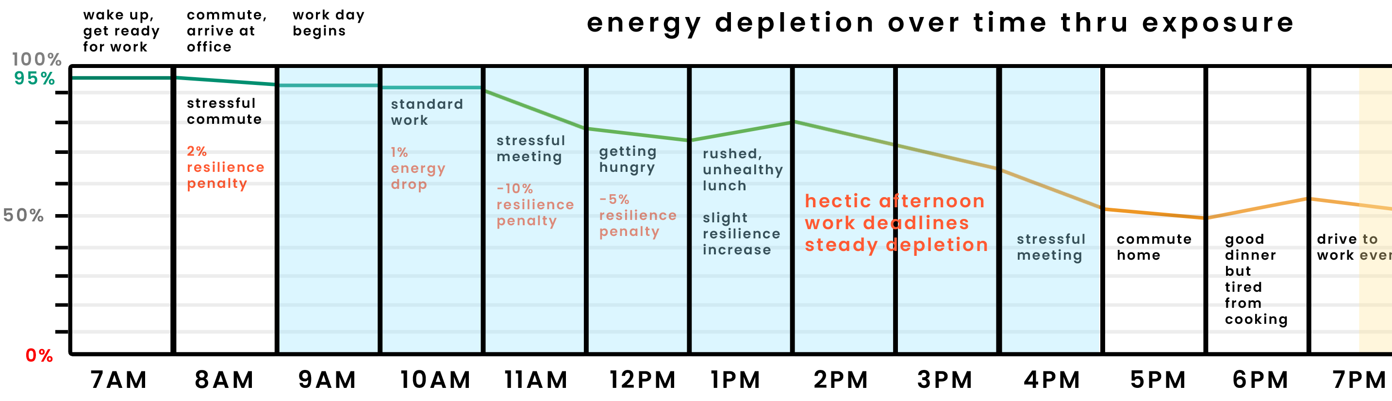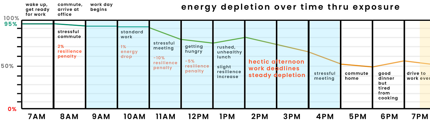 At 11am they have a meeting at work that is highly stressful which chips off some of their resilience and drains some energy. They begin to get hungry which further diminishes their resilience.