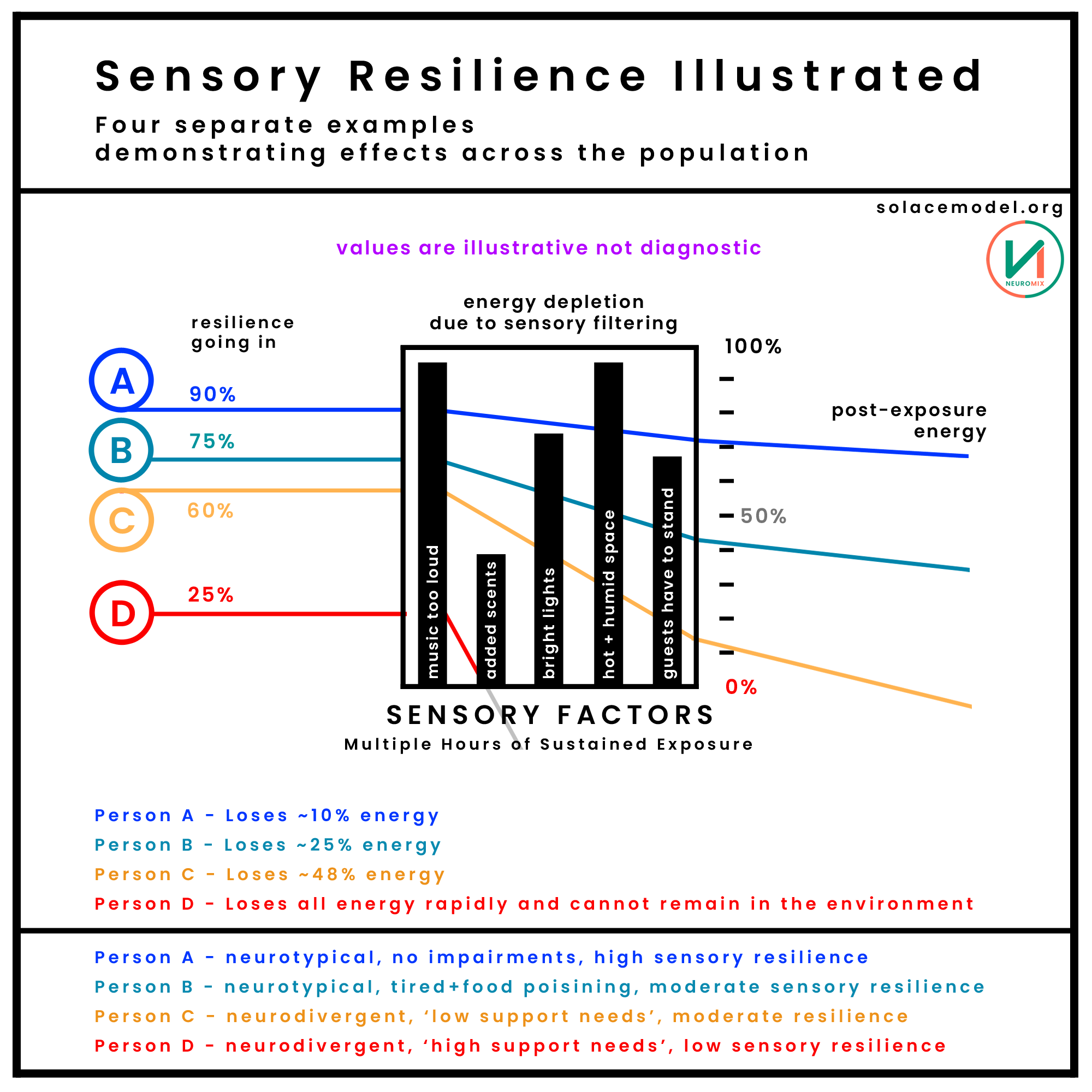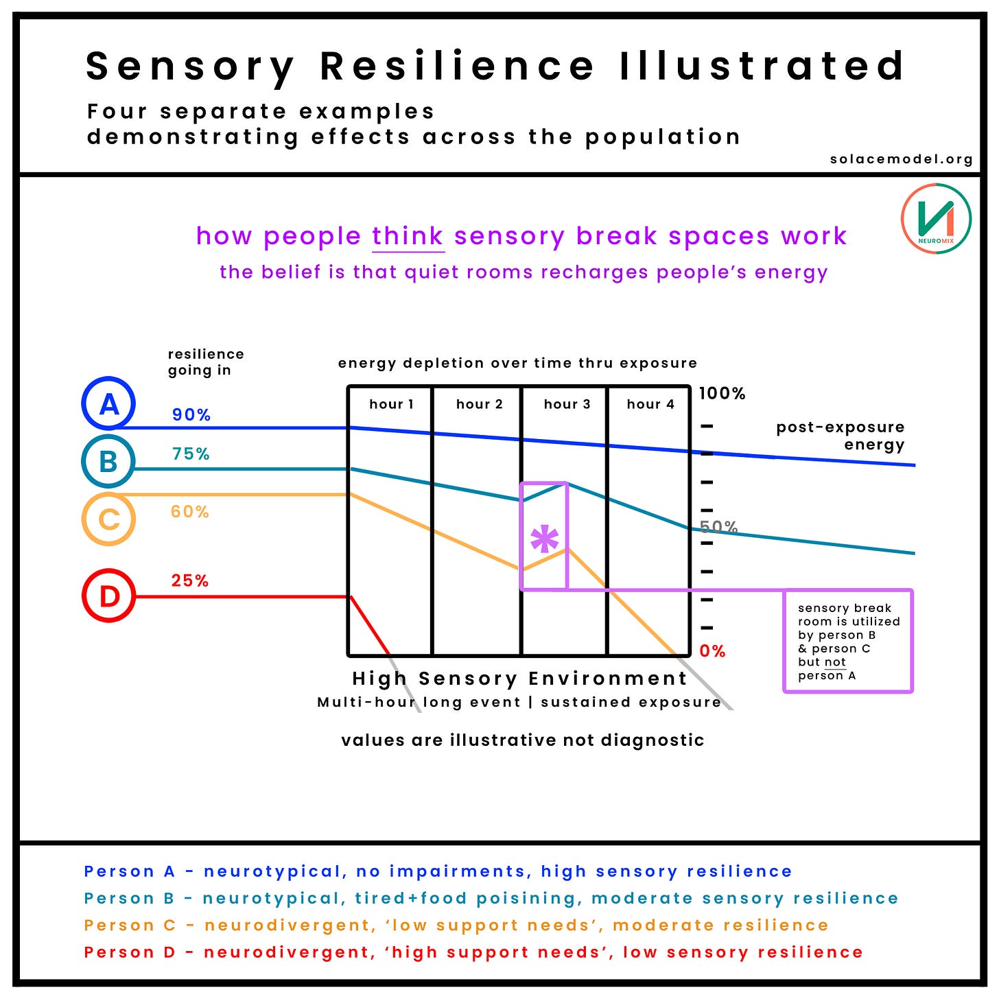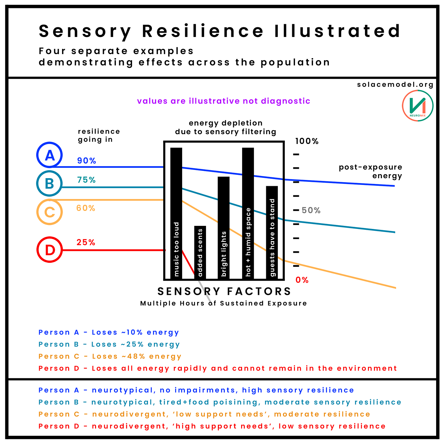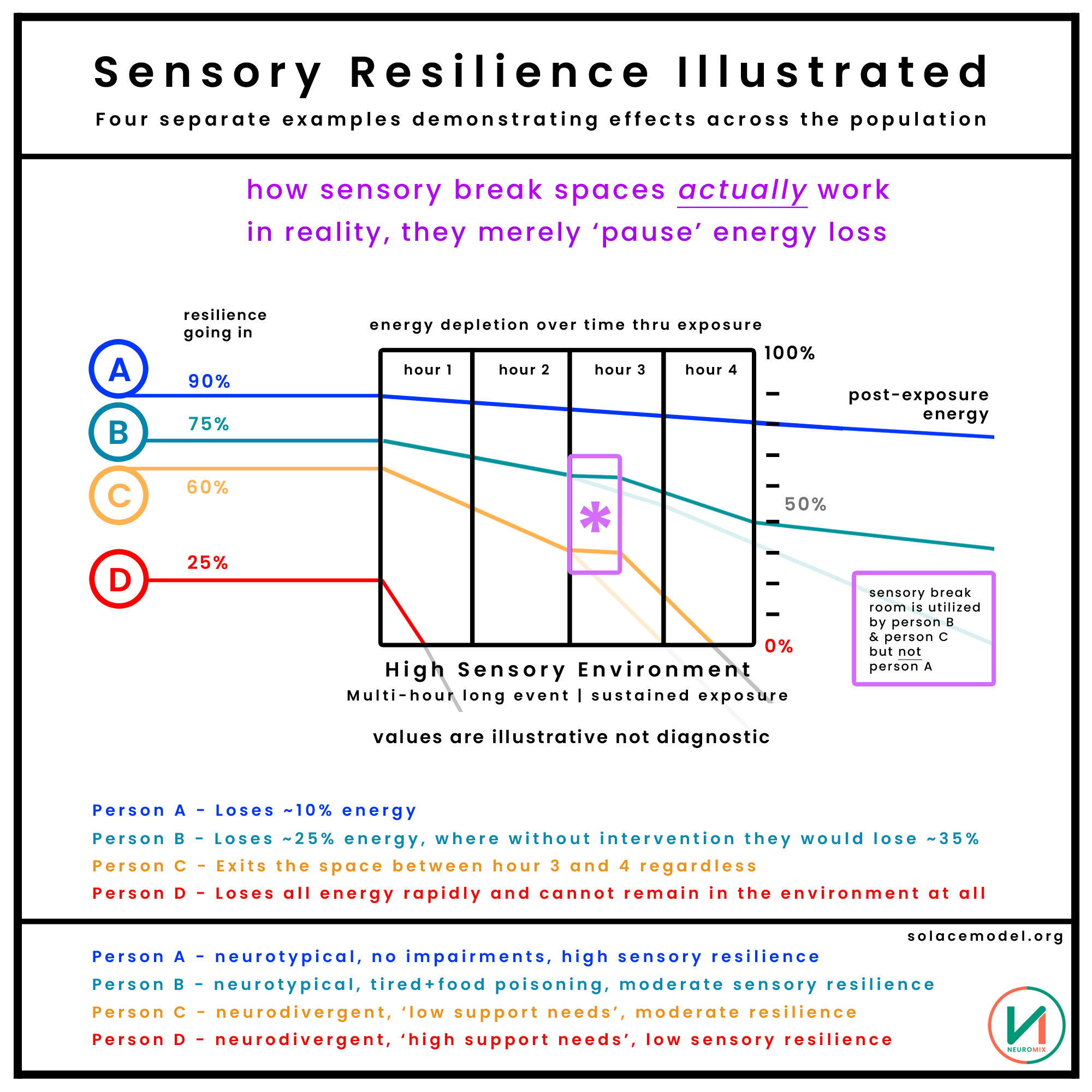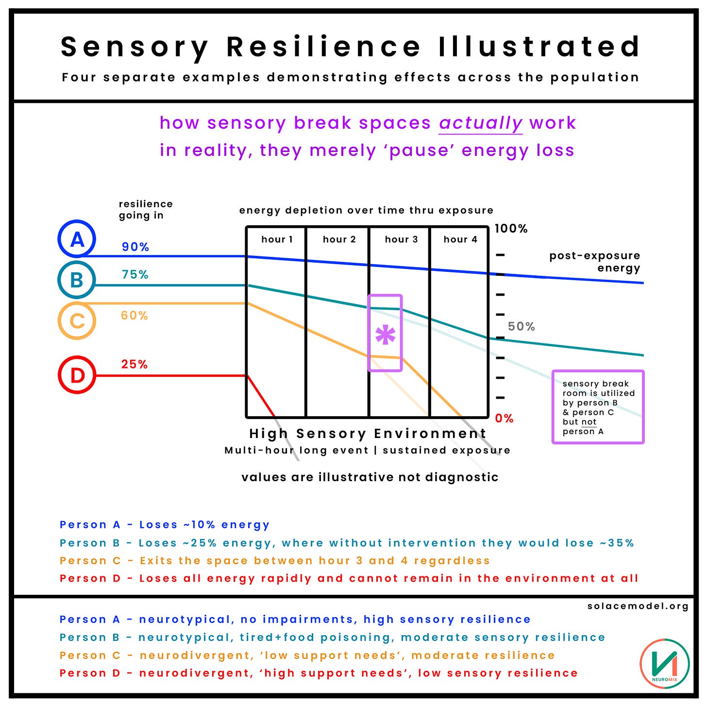 Person C has already depleted approximately half of their available energy after just a couple of hours. If they choose to remain in the space until the very end, they will be severely depleted and even a ‘good night sleep’ will likely not return them to full capacity. They’ve ‘over-extended’, a common outcome when people are required to remain in over-stimulating environments without sufficient regulation built into the space.