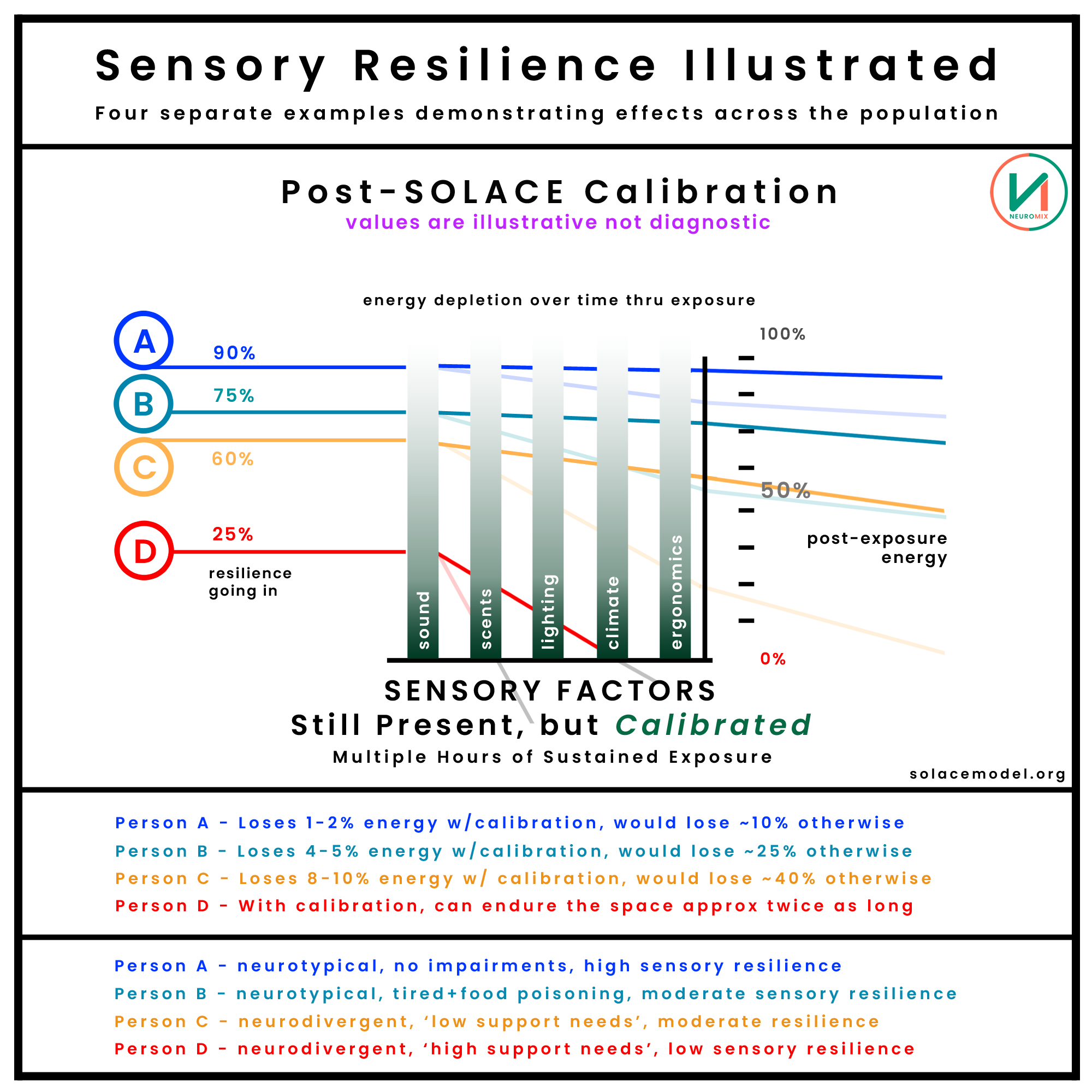 Here is a visualization of what the same event environment would be like for the same four people, if it were calibrated via the SOLACE Model to be within human sensory ‘comfort bands’: