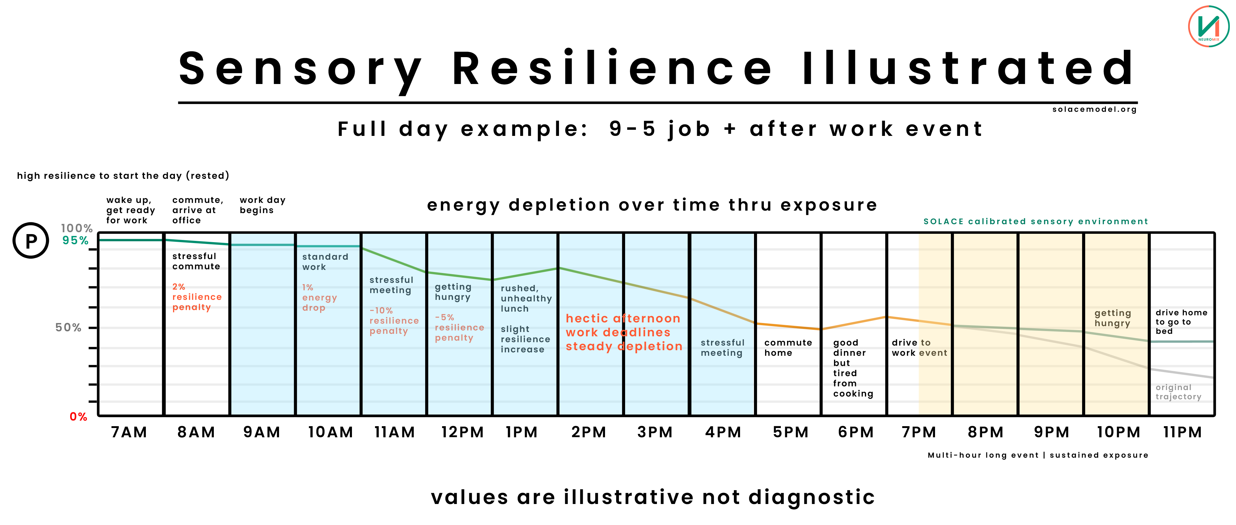 If SOLACE were applied in the venue where the after-work event takes place, the result might look more like this (once again with a ghost line to show the original energy trajectory).