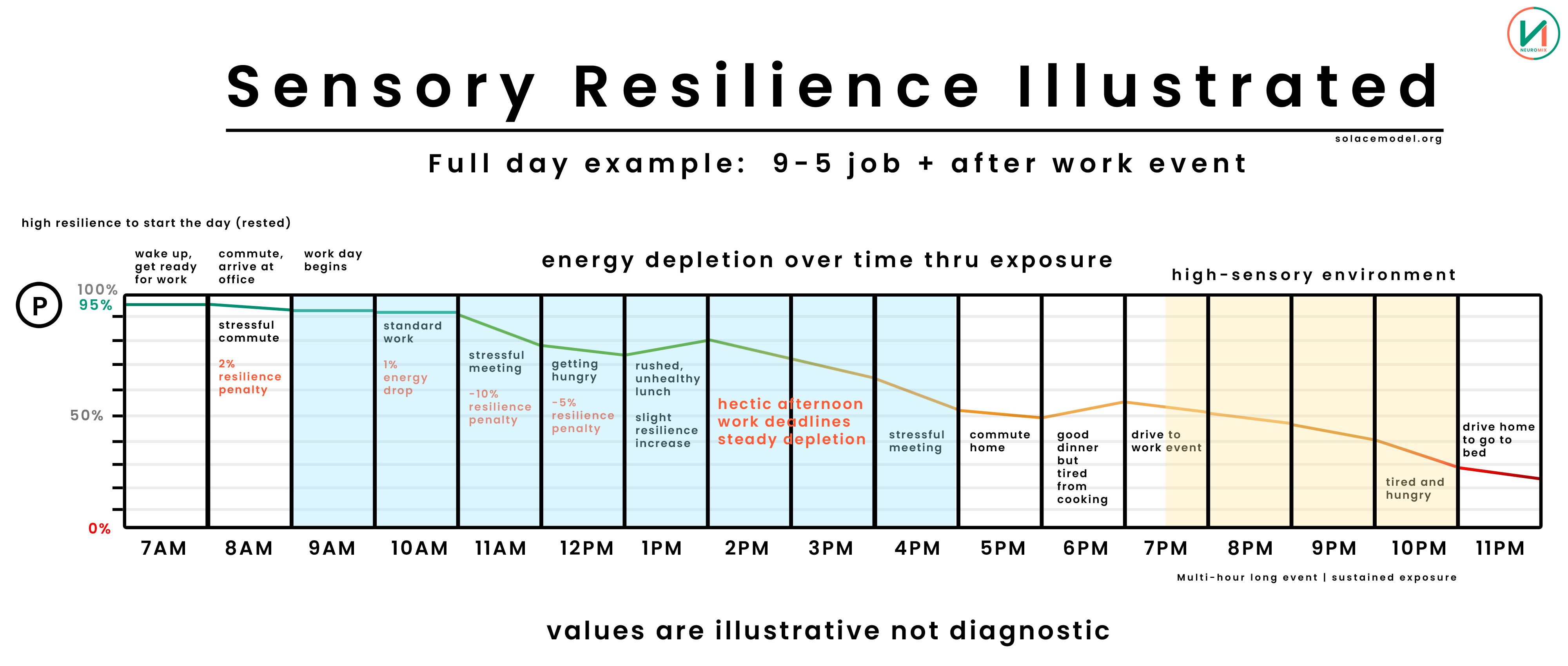 Since this is Person A who does not have any health factors making them more inherently sensitive, the highly stimulating environment of the event has a relatively linear impact on them, but by the end they are tired and hungry and down to 30% by the time they get home and go to bed.