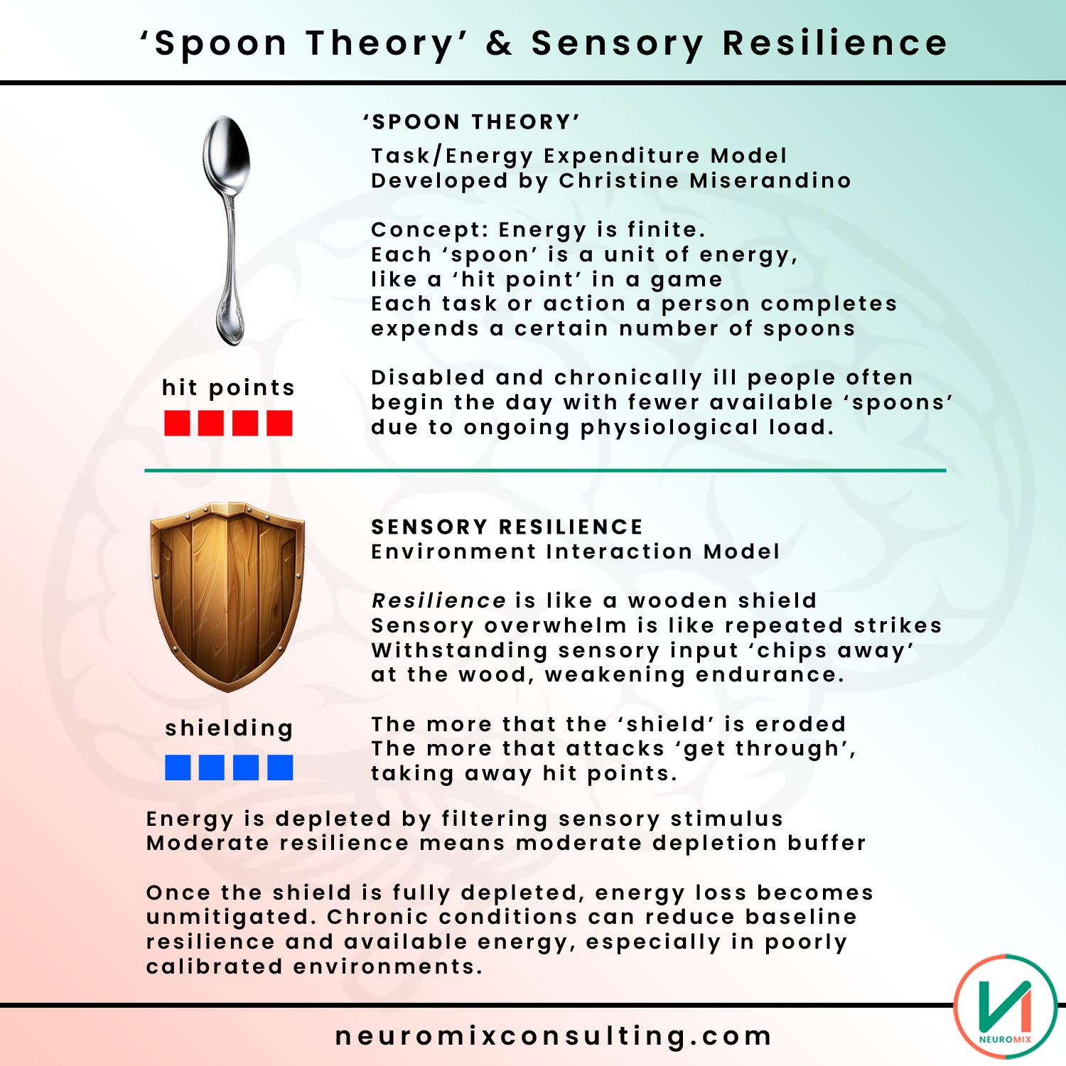 I sometimes use resilience to mean both shield and hit points, because the more ‘damage’ (sensory over-stimulation) a shield takes, the less it protects you and the faster you will ‘lose hit points’.