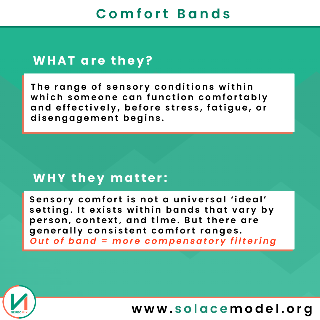 Comfort bands are the range of sensory conditions within which someone can function comfortably and effectively before stress, fatigue, or disengagement begins.