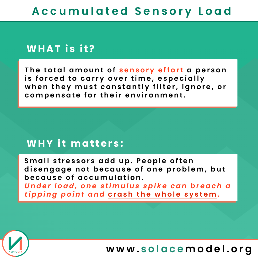 Accumulated sensory load is the total amount of sensory effort a person is forced to carry over time, especially when they must constantly filter, ignore, or compensate for their environment.